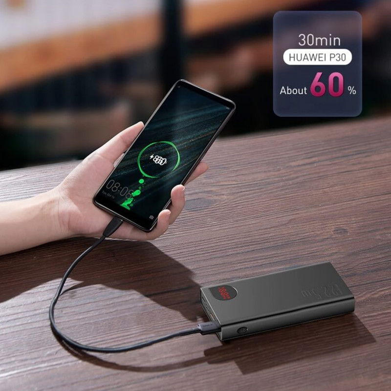 Look no further than our Baseus Power Bank Adaman. This device has a large capacity of 20000mAh and can quick-charge your devices at speeds up to 22.5W. Plus, it features a digital display that shows you the remaining power so you always know how much juice is left.